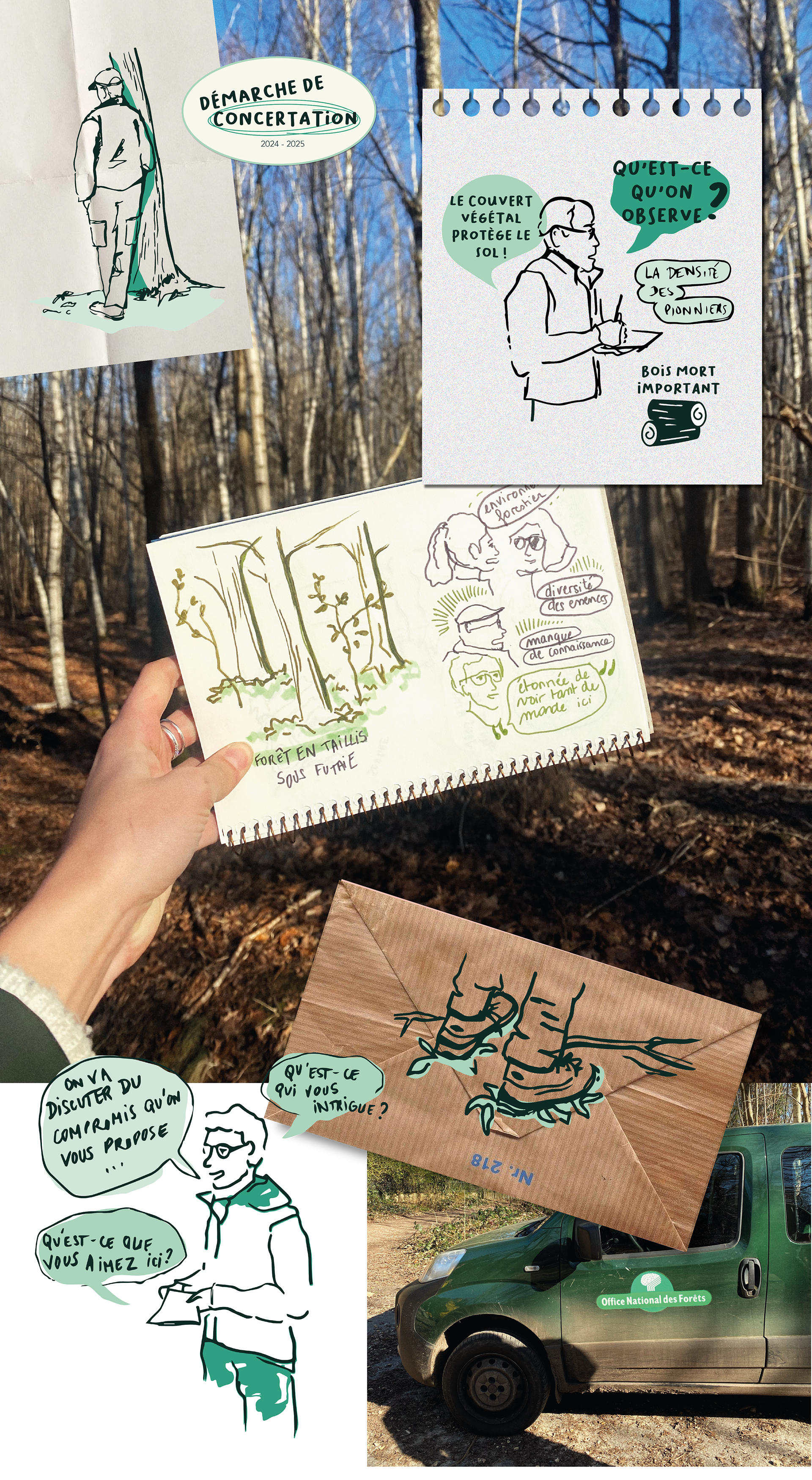 Récit illustré en collaboration avec l'Office National des Forêts qui retrace le chemin parcouru par les acteurs des forêts domaniales de Fausses-Reposes et de La Malmaison dans le cadre d’une démarche de concertation. Il met en lumière les échanges, les idées et les engagements des citoyens autour du renouvellement du plan d’aménagement forestier.